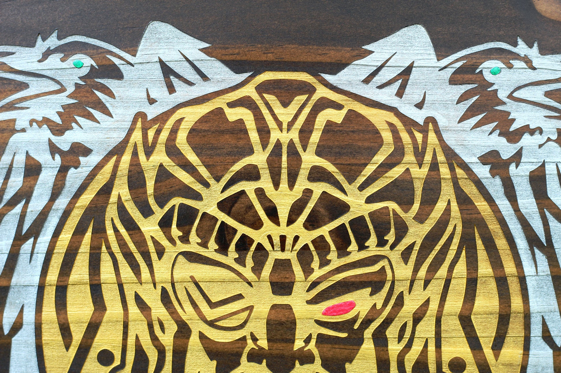 The process starts by choosing the wood. The wood board is then sanded to a smooth finish. It is then washed with a high quality stain and coated with semi-gloss polyurethane. The image is then engraved with an industry leading laser. Next I meticulously add beautiful detail, by hand, using water based acrylic paint. Everything is then sealed with a final coat of semi-gloss poly.