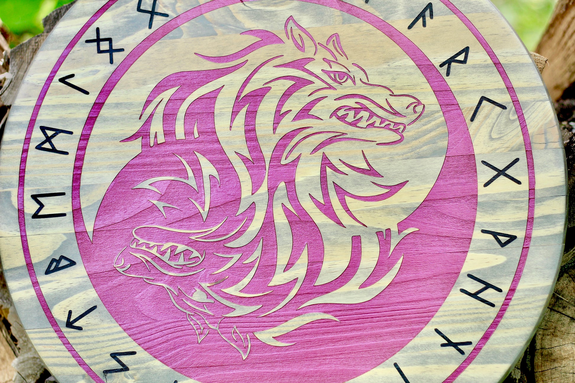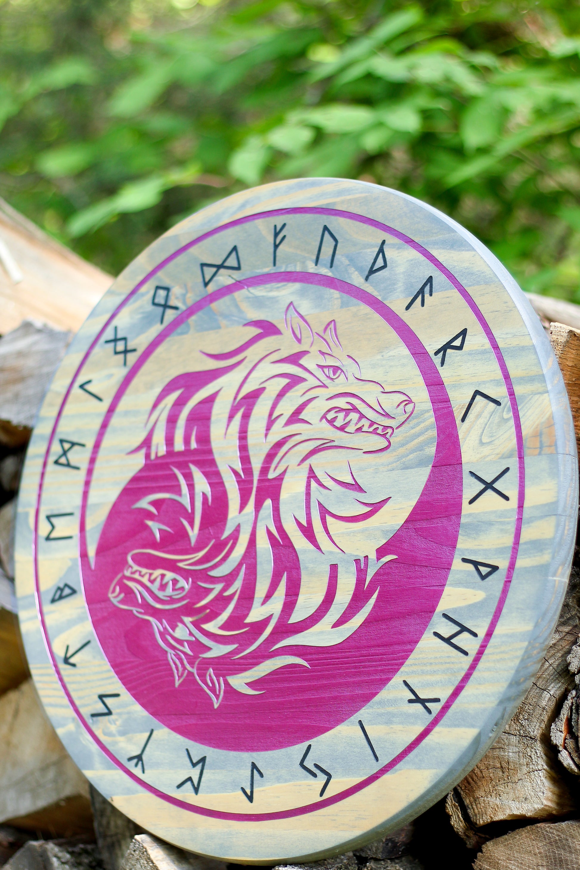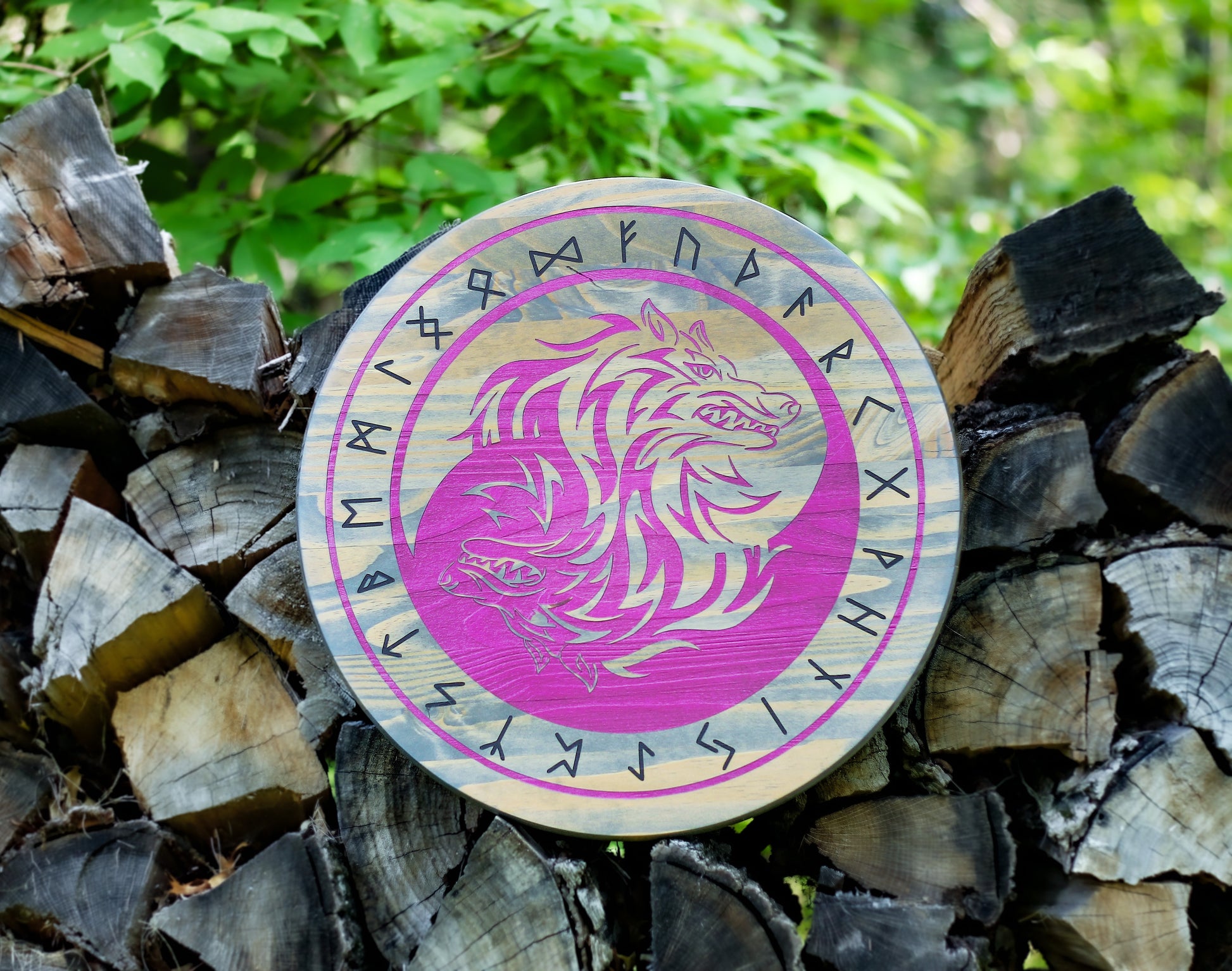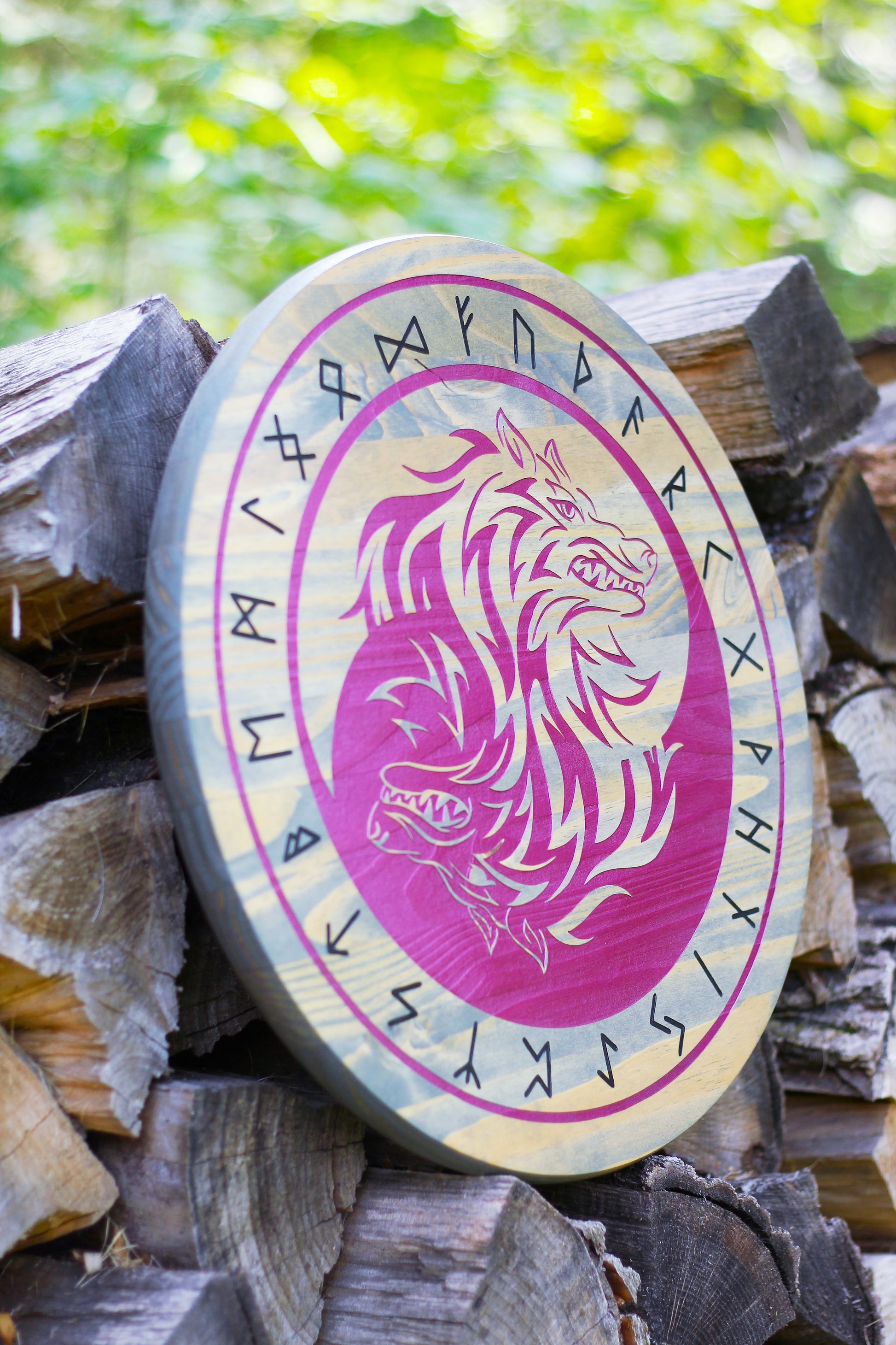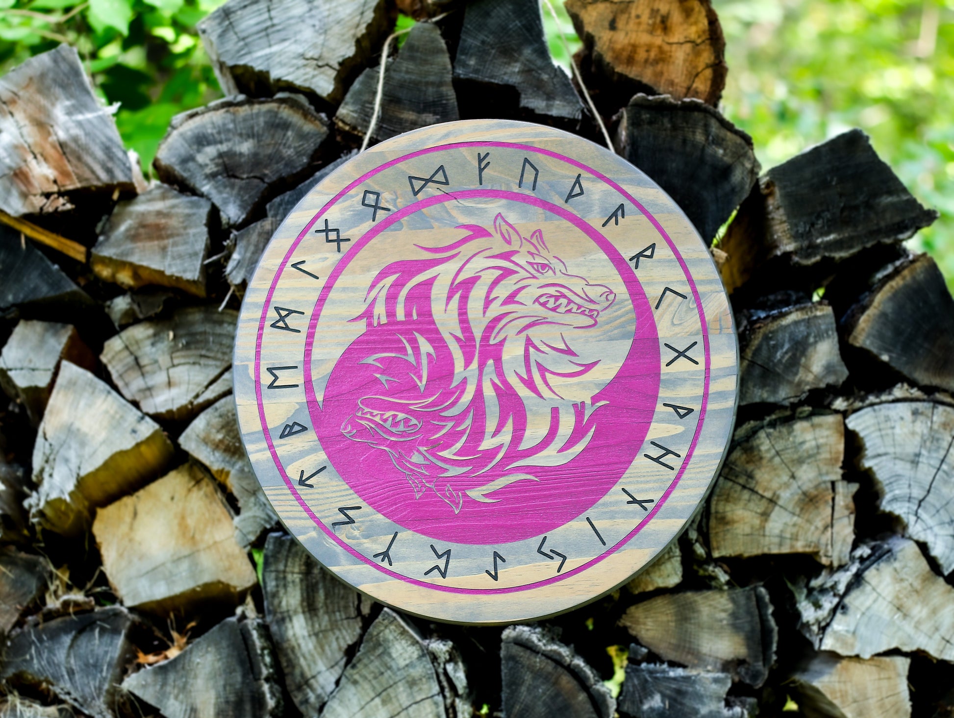 This wall hanging will make a great gift for any lover, collector, or follower of Norse mythology. Skoll and Hati are the sons of Fenrir. In this piece they are depicted in perfect balance of each other representing the light and dark.