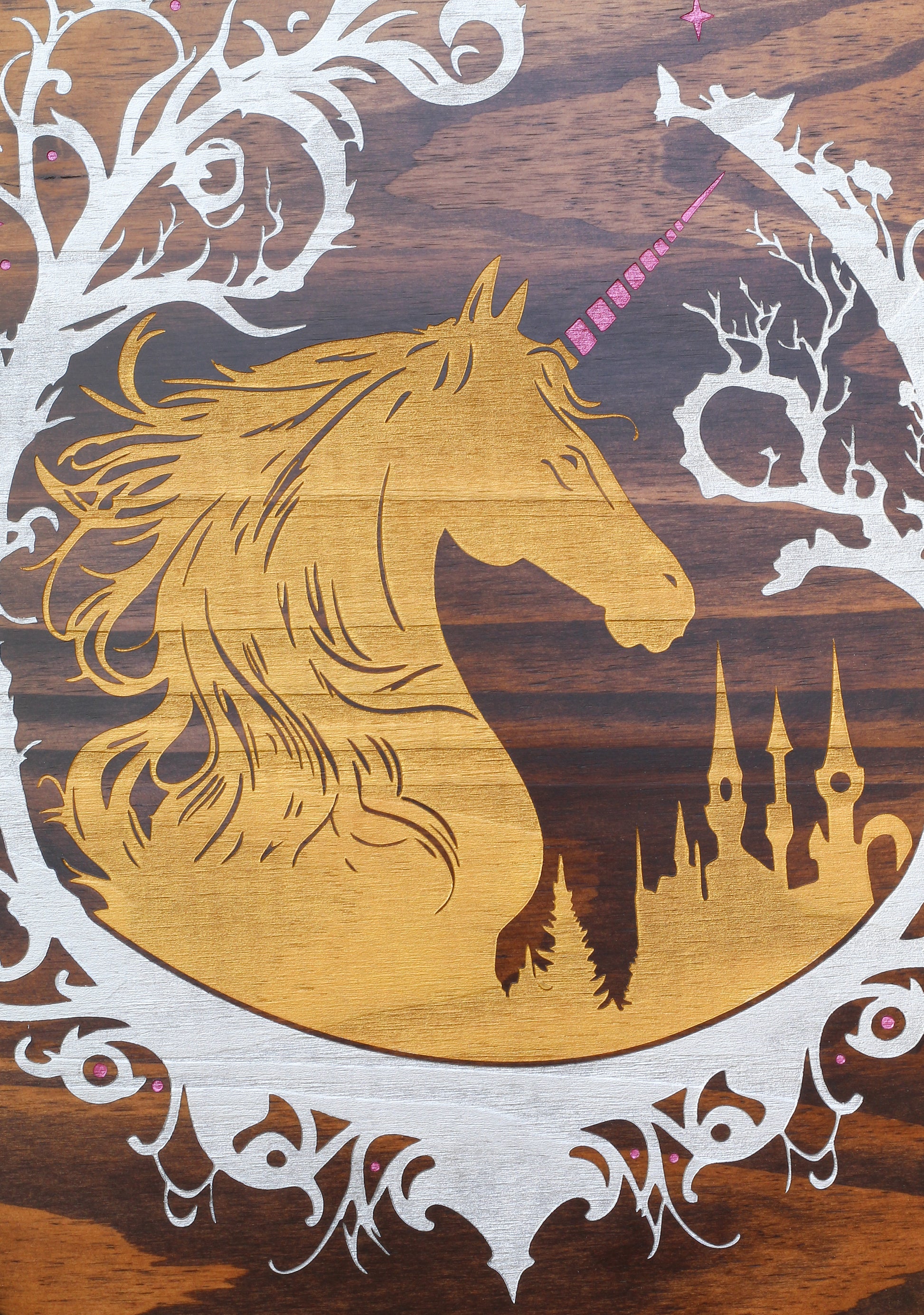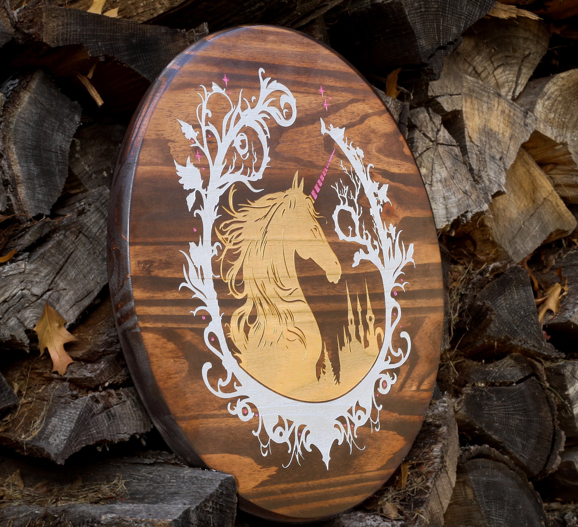 The process starts by choosing the wood. The wood board is then sanded to a smooth finish. It is then washed with a high quality stain and coated with semi-gloss polyurethane. The image is then engraved with an industry leading laser. Next I meticulously add beautiful detail, by hand, using water based acrylic paint in metallic gold and metallic silver. Everything is then sealed with a final coat of semi-gloss poly.